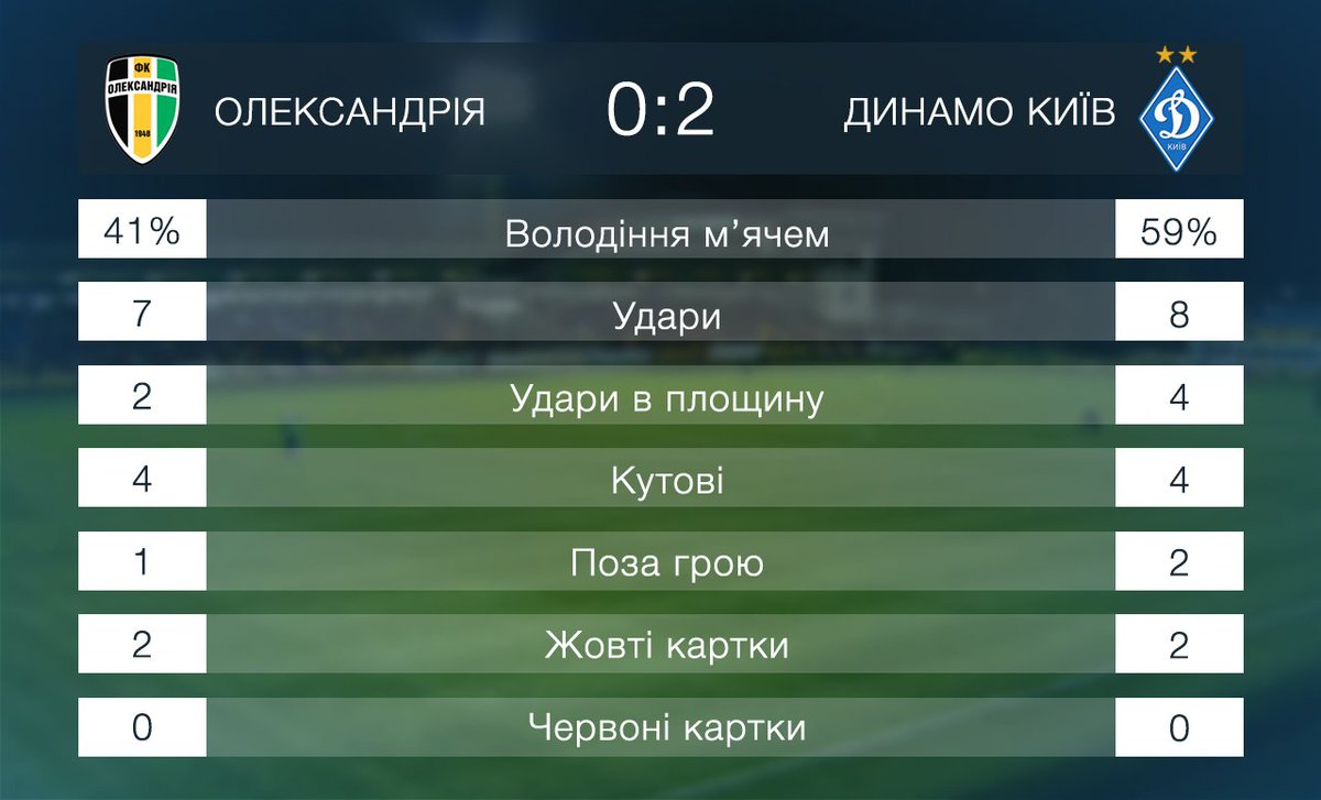 "Динамо": Шовковский (К), 2.Силва, 4.Велозу, 5.Антунеш, 10.Ярмоленко, 11.Мораес(Теодорчик 83), 16.Сидорчук(Буяльский 79), 17.Рыбалка, 20.Гусев(Яковенко 74), 24.Вида, 34.Хачериди